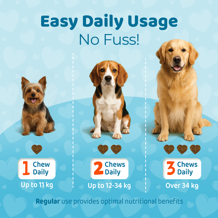 For typical soft-chew supplements: give the recommended number of chews daily, often with or after a meal. The exact amount will depend on the dog’s weight and the particular variant’s instructions (e.g., 1 chew for small dogs, 2 for medium, etc.). Since this brand emphasises ease of use (“soft chews … even picky dogs will love them”).