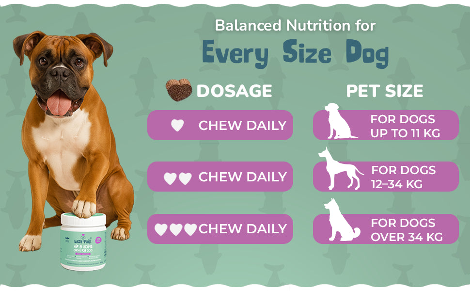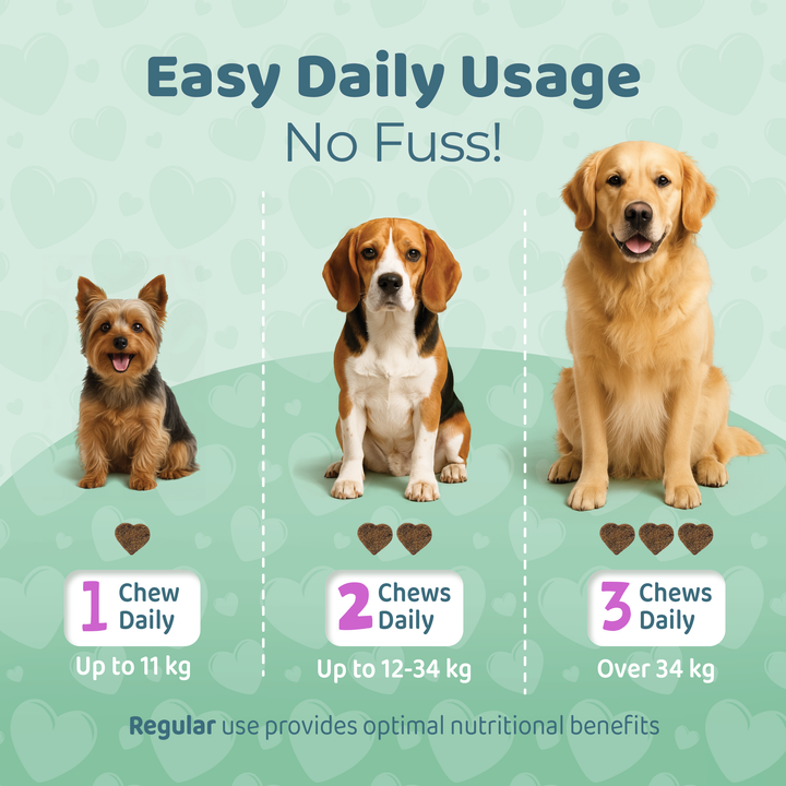 For typical soft-chew supplements: give the recommended number of chews daily, often with or after a meal. The exact amount will depend on the dog’s weight and the particular variant’s instructions (e.g., 1 chew for small dogs, 2 for medium, etc.). Since this brand emphasises ease of use (“soft chews … even picky dogs will love them”).