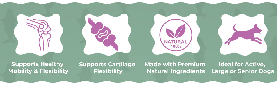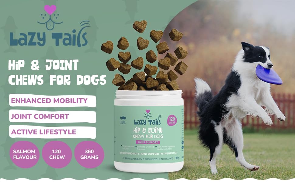 The product is described as having a tasty flavour (e.g., natural salmon flavour for the Hip & Joint chews) to appeal to picky dogs.