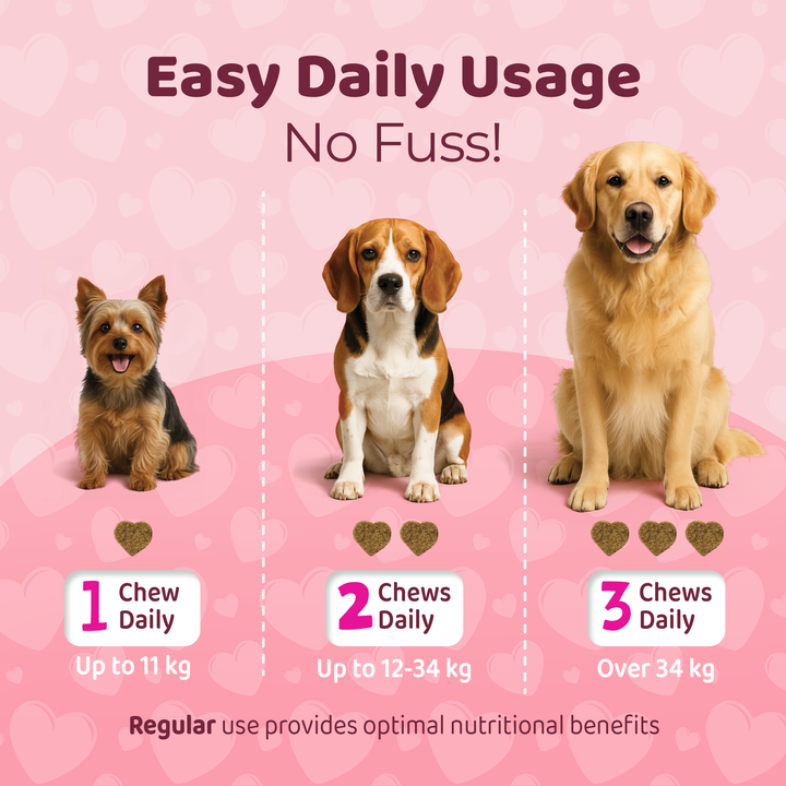 For typical soft-chew supplements: give the recommended number of chews daily, often with or after a meal. The exact amount will depend on the dog’s weight and the particular variant’s instructions (e.g., 1 chew for small dogs, 2 for medium, etc.). Since this brand emphasises ease of use (“soft chews … even picky dogs will love them”).